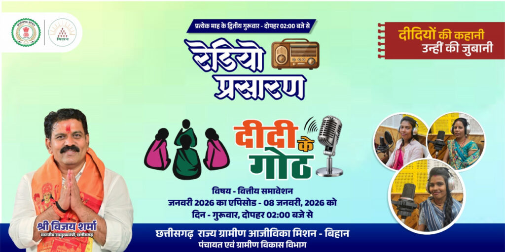 joharcg.com महिलाओं के आर्थिक सशक्तिकरण और वित्तीय समावेशन को जन-जन तक पहुंचाने के उद्देश्य से प्रसारित किए जा रहे कार्यक्रम ‘दीदी के गोठ’ का छठवां एपिसोड 08 जनवरी को प्रसारित किया जाएगा। यह कार्यक्रम ग्रामीण और शहरी क्षेत्रों की महिलाओं, विशेषकर स्व-सहायता समूहों से जुड़ी दीदियों के बीच काफी लोकप्रिय हो रहा है।
