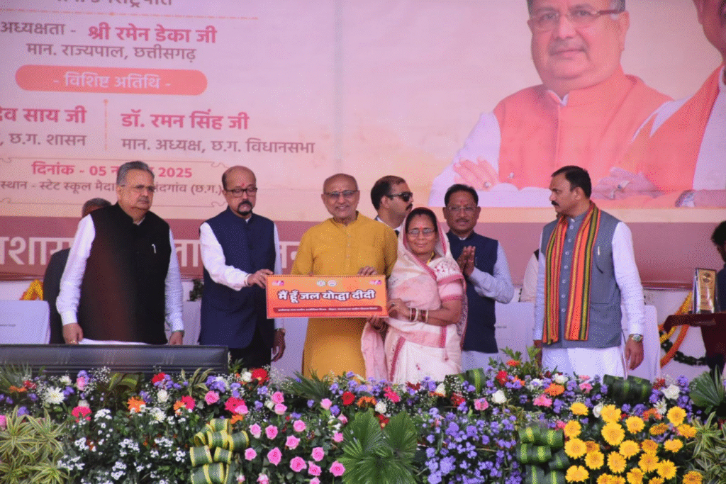 joharcg.com राजनांदगांव के स्टेट हाई स्कूल मैदान में आयोजित लखपति दीदी सम्मेलन में देश के उपराष्ट्रपति श्री सी.पी. राधाकृष्णन, राज्यपाल श्री रमेन डेका, मुख्यमंत्री श्री विष्णु देव साय, विधानसभा अध्यक्ष डॉ. रमन सिंह सहित अनेक जनप्रतिनिधि शामिल हुए। इस अवसर पर उपराष्ट्रपति ने महतारी वंदन योजना और नियद नेल्लानार योजना के तहत 69 लाख 15 हजार 273 हितग्राहियों को कुल 647 करोड़ 28 लाख 36 हजार 500 रुपए की राशि डीबीटी के माध्यम से अंतरित की।